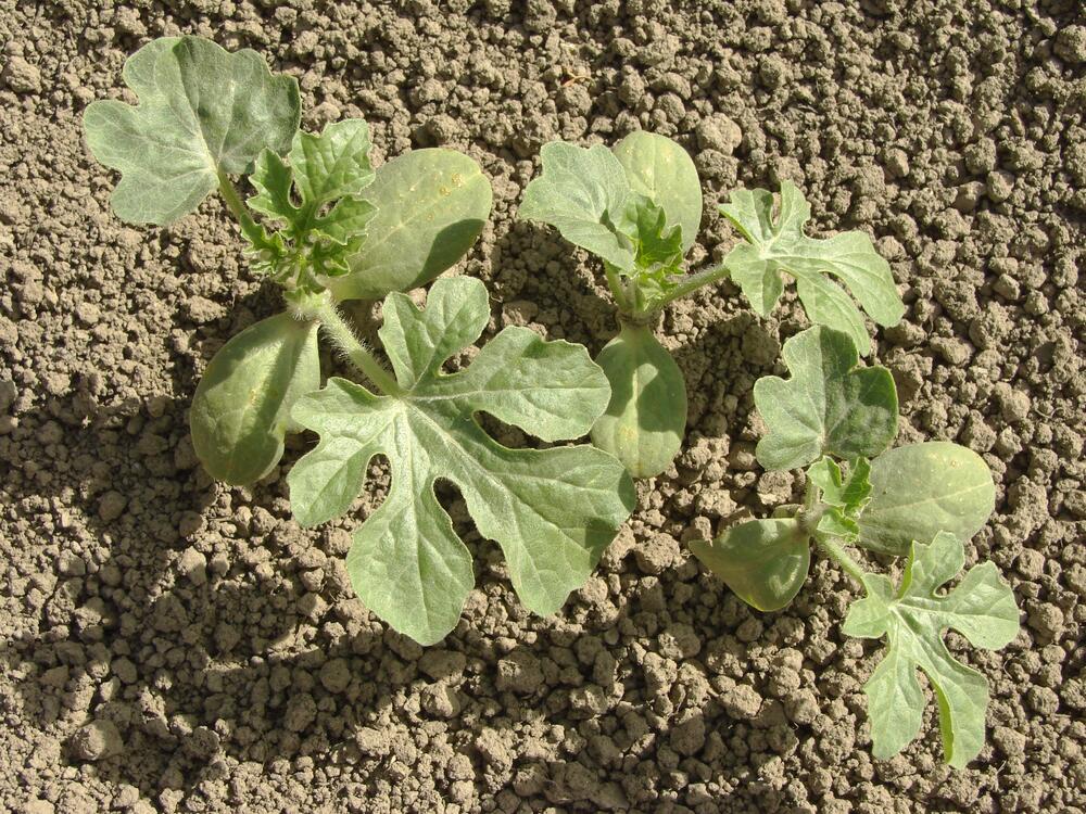 В некоторые лунки высаживаю выращенную рассаду арбузов (с 2−3 настоящими листиками), а между рассадой все равно сею еще и семена. Через неделю посев семенами повторяю во все лунки точно таким же образом. Теперь, если рассада или первые всходы погибнут или начнут болеть от холодов, то второй эшелон ростков уцелеет. Зачастую бывает, что всходы более позднего посева перегоняют в развитии даже рассаду, и именно они дают самые хорошие плоды. Сею так густо в лунки для того, чтобы потом, в условиях жесточайшей конкуренции, была возможность оставить самые сильные растения. Расход семян получается большой, но поскольку семена я заготавливаю самостоятельно и всегда с запасом, то для меня это не проблема.