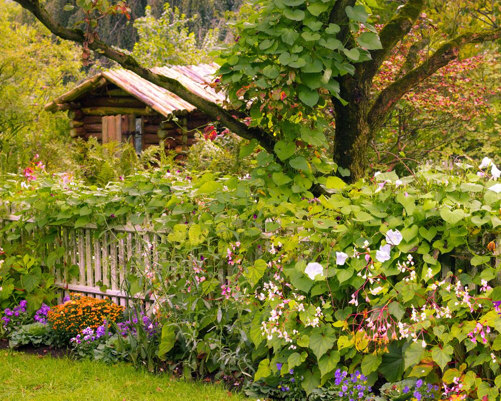 Могу просто добавить, что также в селянский сад, особенно на плетень, стоит запустить цветушщую фасоль, душистый горошек, настурцию.