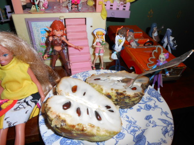 А всё-таки уговорил дядю привезти из Тая черимойю. Он сначала не хотел везти, но перед самым отлётом купил. И главное - она не обманула ожиданий! Правда, хотя черимойя и вкуснее, чем её родственник Дракон, но в ней полно косточек, а в Драконе только мелкие семечки.