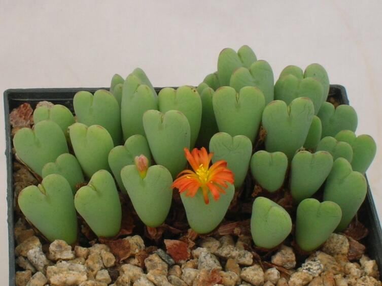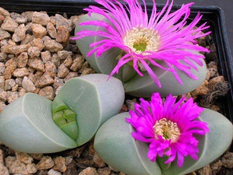 Более известна как «живые камни». Удивительное по красоте неприхотливое растение, сочетающее массивность и строгость тела, похожего на камень формой и цветом (серо-зеленые, мясистые, очень толстые листья), с тонкостью, хрупкостью и яркостью цветка.
