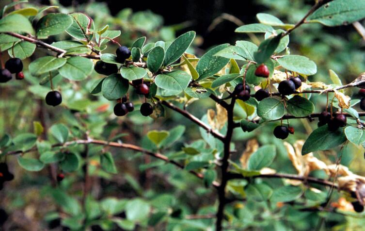 - Кизильник черноплодный — вырастает до двух метров, отлично реагирует на стрижку, из этого вида можно создать замечательную живую изгородь. Необычайно красив этот декоративный кустарник осенью, когда листья окрашиваются в различные тона красного, багряного цвета, а на ветках блестят чёрные бусинки плодов. К условиям выращивания неприхотлив, размножается семенами, черенками, отводками. Засуху переносит, но урожайность будет более высокой на увлажнённых почвах.