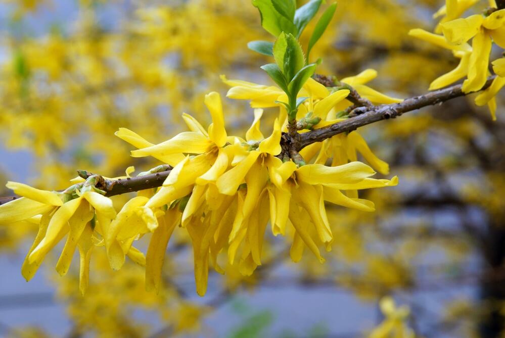 Ещё один легко приживающийся и неприхотливый кустарник — форзиция, или золотой дождь, как часто её называют в народе. Цветёт раньше сирени и, как следует из названия, покрывается солнечно-жёлтыми цветками.