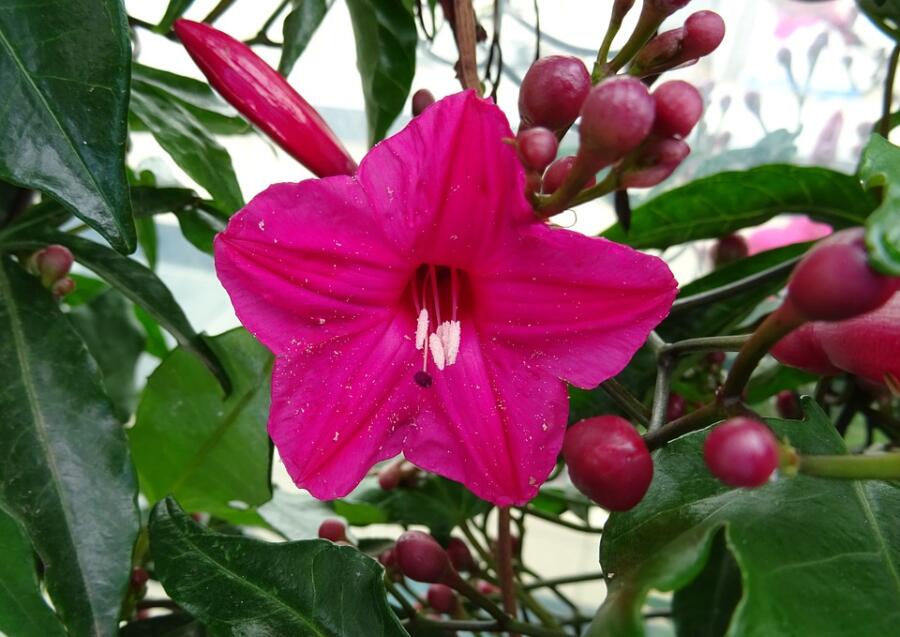 Квамоклит лопастный «Рубиновый ковер». Имеет многочисленные карминно-красные цветки диаметром 3 см. Хорошо выносит пересадки.