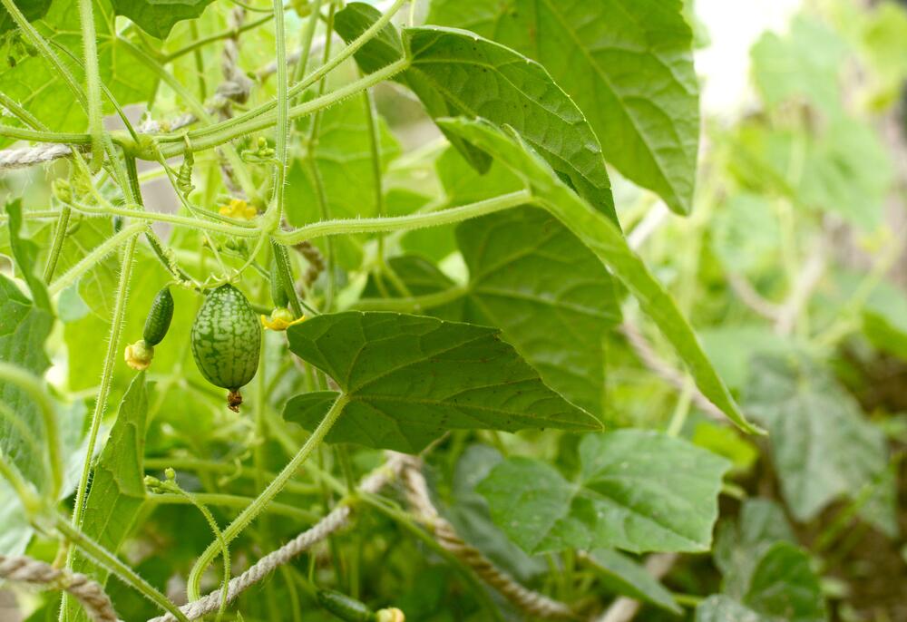 Первые дни рассаду притеняю от жаркого солнца. Рядом устанавливаю опоры, по которым лиана карабкается вверх. За сезон я дважды вношу удобрения под мелотрию. Первый раз: через 3 недели после высадки рассады делаю подкормку органическим удобрением. Еще через 3 недели вношу подкормку минеральным удобрением, как и для всех тыквенных.