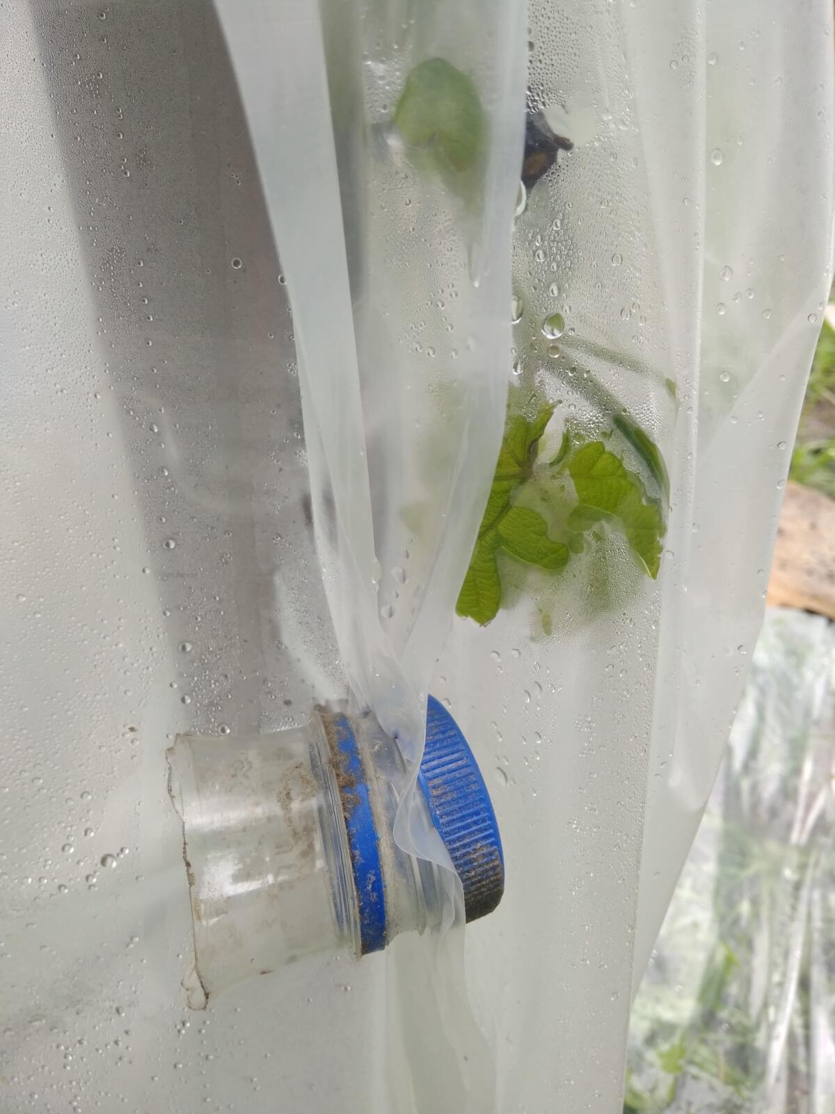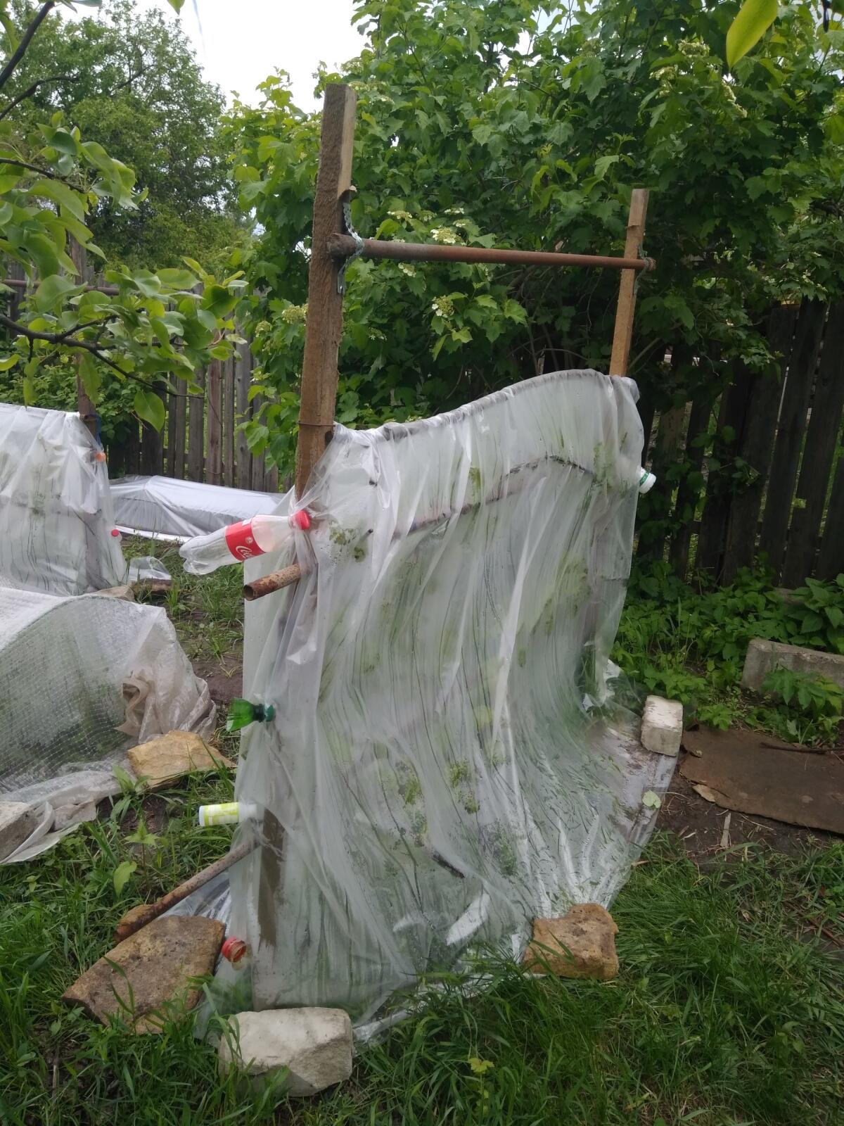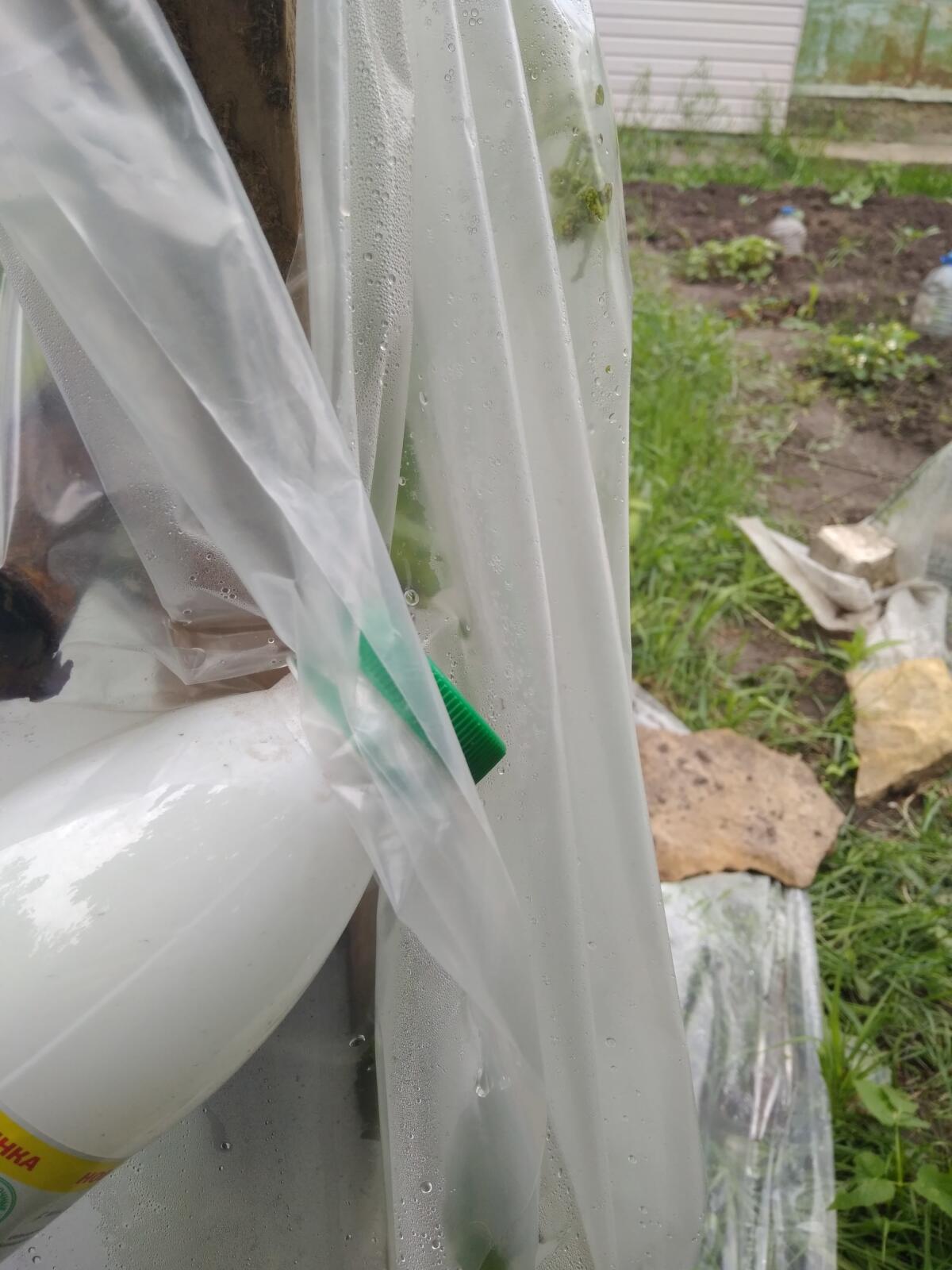 А тут ветерок подул шквалистый. А я рад — вот, думаю, сейчас проверим, как держат такие крепления. Отлично держат! Теперь я знаю, как соединить два куска плёнки между собой: нужно иметь под рукой несколько пустых полиэтиленовых бутылок с крышечками.
