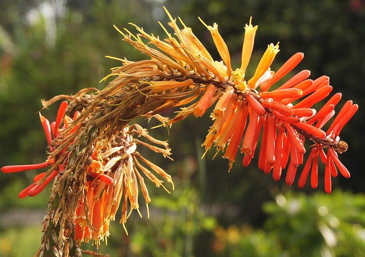 Пышные кистевидные соцветия, расположенные на мощных цветоносах, поднимаются высоко, порой до 2 метров, освещая в вечерние часы участок кораллово-красным и желтовато-золотистым сиянием. Длина соцветий около 25 см. Цветение начинается в июле и продолжается более двух месяцев.
