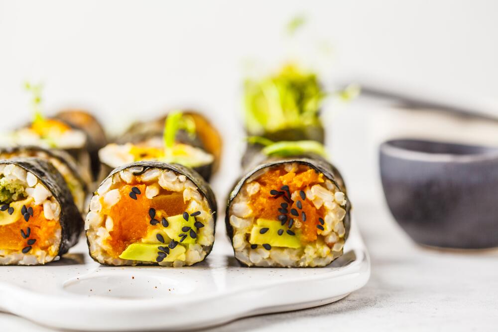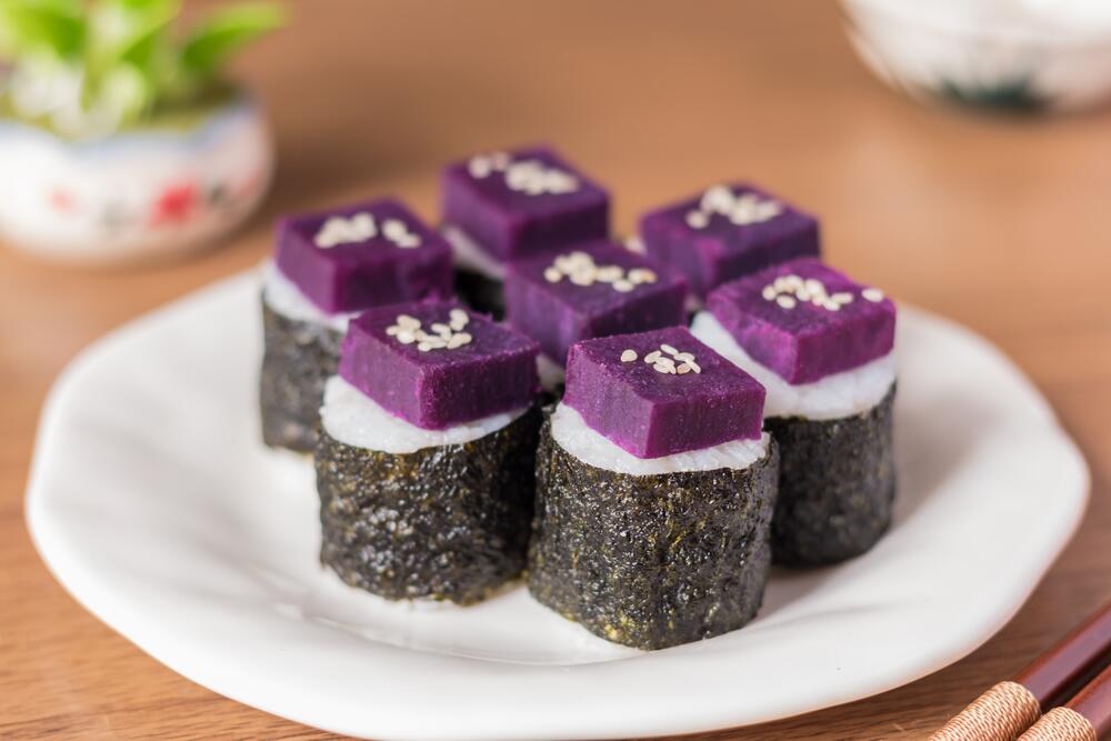 Для их приготовления понадобятся: рисовая бумага, сырой батат с оранжевой мякотью, рис для суши, огурец и пекинская капуста, а также азиатские соусы.