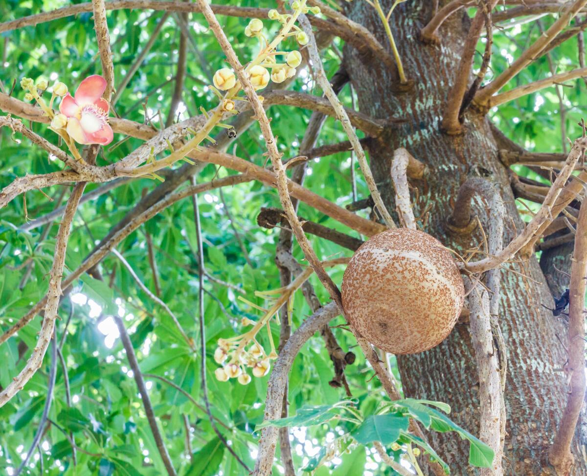 Ещё более экстравагантным становится дерево, когда на нём появляются плоды: крупные, диаметром до 20 см, коричневые, схожие с ядрами старинных пушек. Они свисают с деревьев и при дуновении ветра стучат друг о друга, создавая грохот, напоминающий канонаду.