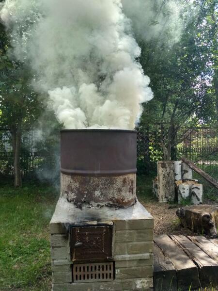 Меняется погода в самый неподходящий момент, начинается дождик, прячем под навес материалы, инструменты, запасаемся спичками, идём к печи сжигания мусора и растительных отходов, поджигаем в ней ранее приготовленную сухую закладку из бумаги, коры берёзы, щепок, сухих дров.