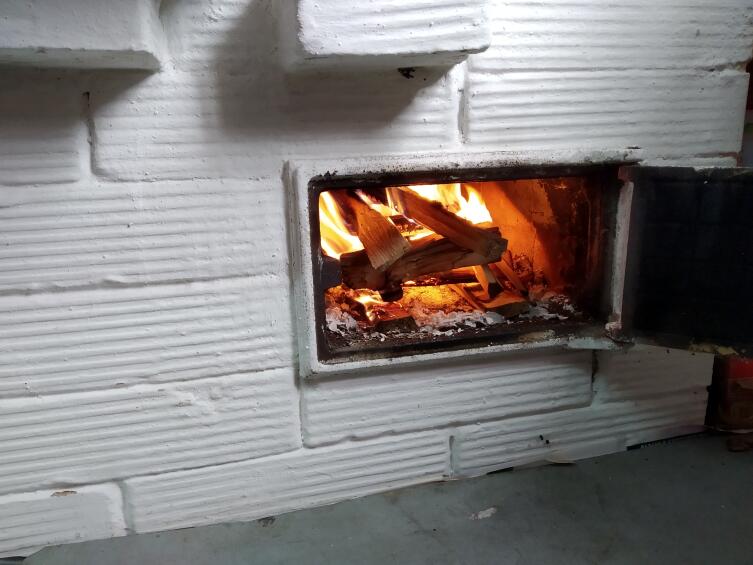 В течение часа прогрев трубы завершается, за это время успеваю подготовить печь к работе: закладка растопки, очистка стекла дверцы топливника, складирование дров в объёме топки на крыльце дома.