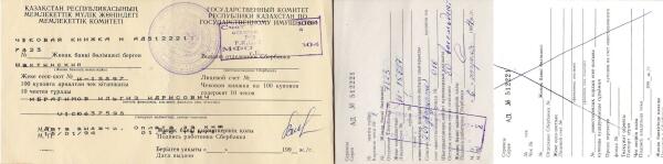 А вот этим с нами расплачивались в Казахстане, когда Союз развалился в 1991 году, когда наличные рубли кончились, а безналичные рубли перевели на эти чековые книжки. Одна месяц - 12 чеков. И крутись, как хочешь. Магазины еще были советские - каждый отдел отдельно. Если бы были современные - сам ходишь, набираешь из одного зала все виды товаров и один лишь раз расплачиваешься на кассе. А с этими чеками - газету хочешь купить - один чек долой, булку хлеба - тоже минус чек, и так по мелочи куча платежей, а книжка одна. Хорошо еще - не долго эта система продержалась. Оперативно свою валюту ввели, а в ФРГ тенге напечатали по виду дойчмарок.
