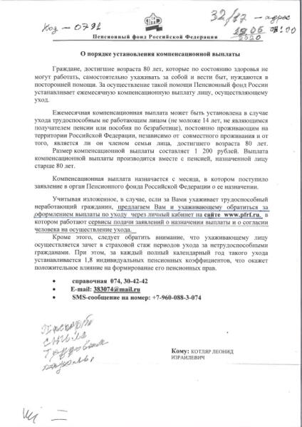 И не только, обязательно — знать свои права. Мне исполнилось 83 года, когда получил письмо Пенсионного фонда РФ (ПФР) «О порядке установления компенсационной выплаты» — 1200 руб. гражданам, достигшим возраста 80 лет по уходу за ними.
