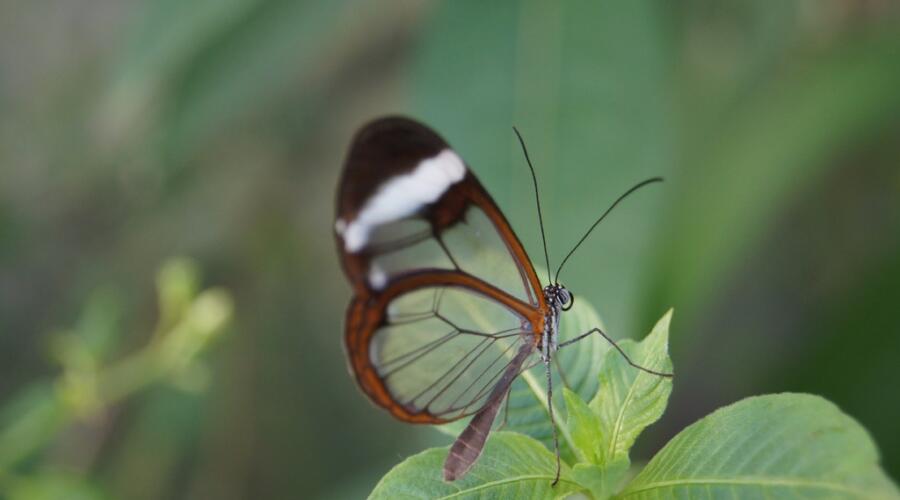 Неожиданно деревья расступились и перед путешественниками открылась небольшая поляна. В ярких лучах солнца кружилась красивая бабочка с прозрачными, как и у стеклянной бабочки, крыльями. Лишь по краям они были окрашены в чёрный цвет, а по нижней части крыльев проходили красно-белые полосы.