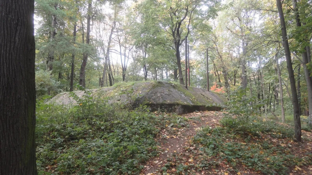 Во время войны в парке располагался запасной командный пункт (ЗКП) Ленинградского фронта (так называемый объект «Нева»). На фотографии — надземная часть бункера. Так же, как у айсберга, у которого над водой — самая его малость.
