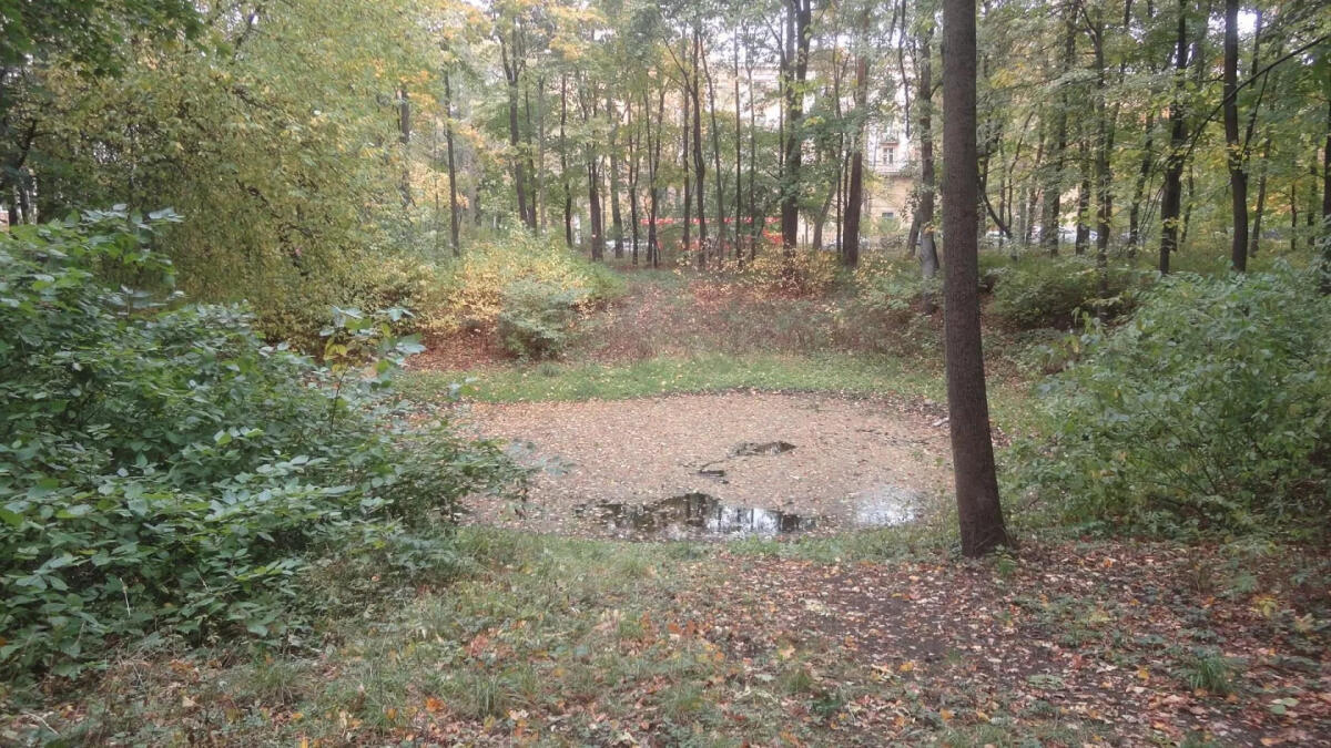 Естественно, немцы знали о ЗКП и месте его расположения. Поэтому парк бомбили. Одну из воронок от взрыва 1800-килограммовой авиабомбы, которыми немцы пытались уничтожить ЗКП Ленфронта, и сегодня можно увидеть в непосредственной близости от улицы Новороссийской, напротив дома № 26 (общежитие бывшего факультета МТД).