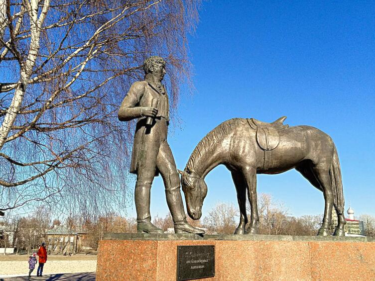 А вот памятник тезке, Константину Батюшкову, с понурившим голову боевым конем. Именно к нему мы выходили от церкви Сретенья на набережной 6-й армии, где у нас была общага, когда зимой шли в институт напрямую, по льду замерзшей реки.