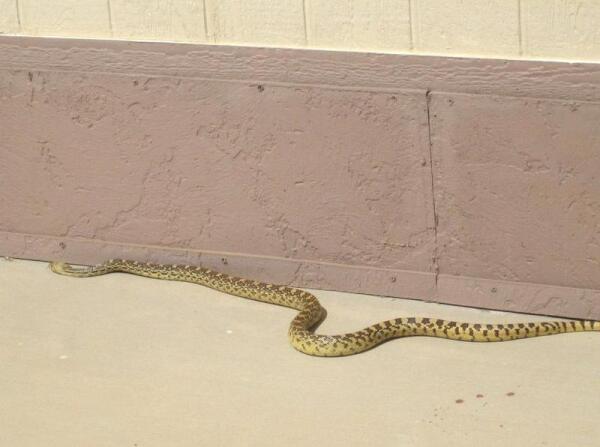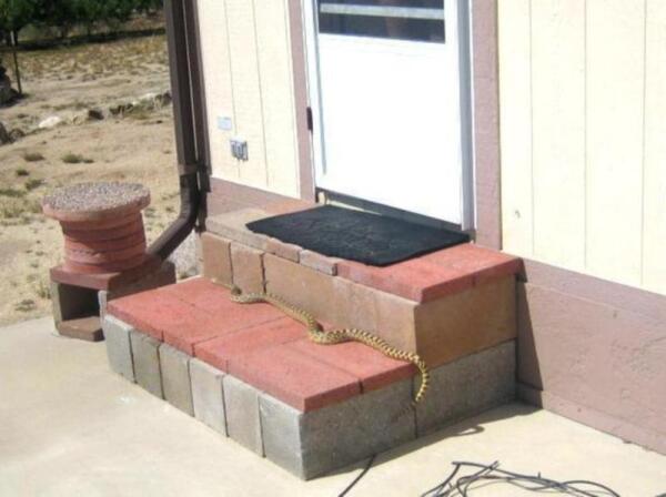 Змея уже на крыльце, можно видеть, какая она длинная. Животное, вероятно, хотело «зайти к нам в гости», но мы ее не пригласили, поэтому она продолжила свой путь. Миновав крыльцо, змея завернула за угол и уползла в щель под домом. Там она провела несколько дней.