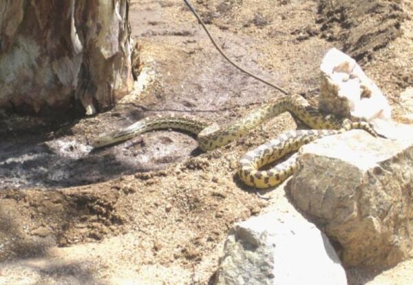 Как-то я вышла из дома и увидела около эвкалипта огромную змею, которая со своей светлой окраской была почти незаметна среди камней. Я быстренько сгоняла за камерой и, как оказалось, вовремя. Змея неспешно направилась к дому. Вдруг она показалось из-за камней во всей красе! Первый порыв был — убежать, но любопытство взяло верх, что же будет дальше. При ближайшем рассмотрении змея оказалась очень симпатичной, с красивым узором гибкого тела. И я решила наблюдать и фотографировать до конца…