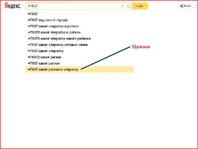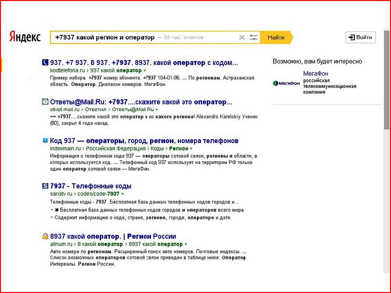 Предположим, в автоматическом определителе у вас «засветился» номер, начинающийся так +7937… Заходим в поисковик Яндекса (можно и в любой другой) и в строке поиска вставляем эти цифры, нажимаем «Найти». Что получили мы? Смотрите первый скриншот. На нем видим несколько вариантов для поиска. Нажимаем на нижний, чтобы определить регион и оператора. Далее уже понятно, что префикс 937 принадлежит в России только одному оператору мобильной связи — Мегафону. Пытаемся вспомнить, кто из подозреваемых имеет номер от Мегафона. Разумеется, это чересчур неэтично, подозревать сразу всех с таким префиксом. Тем более что в числе подозреваемых хулигана может и не оказаться как раз. И находиться он может у черта на куличках, а вовсе не рядом где-то с вами.