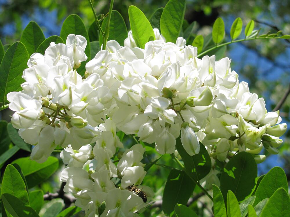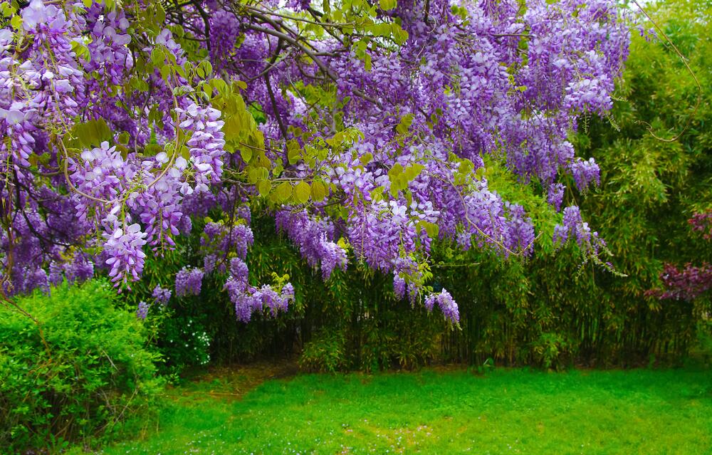 В конце мая заброшенный угол участка преобразился: Акация стояла в облаке белоснежных душистых цветков, а с них ниспадал до земли сиренево-голубой водопад цветущей королевы лиан — Глицинии.