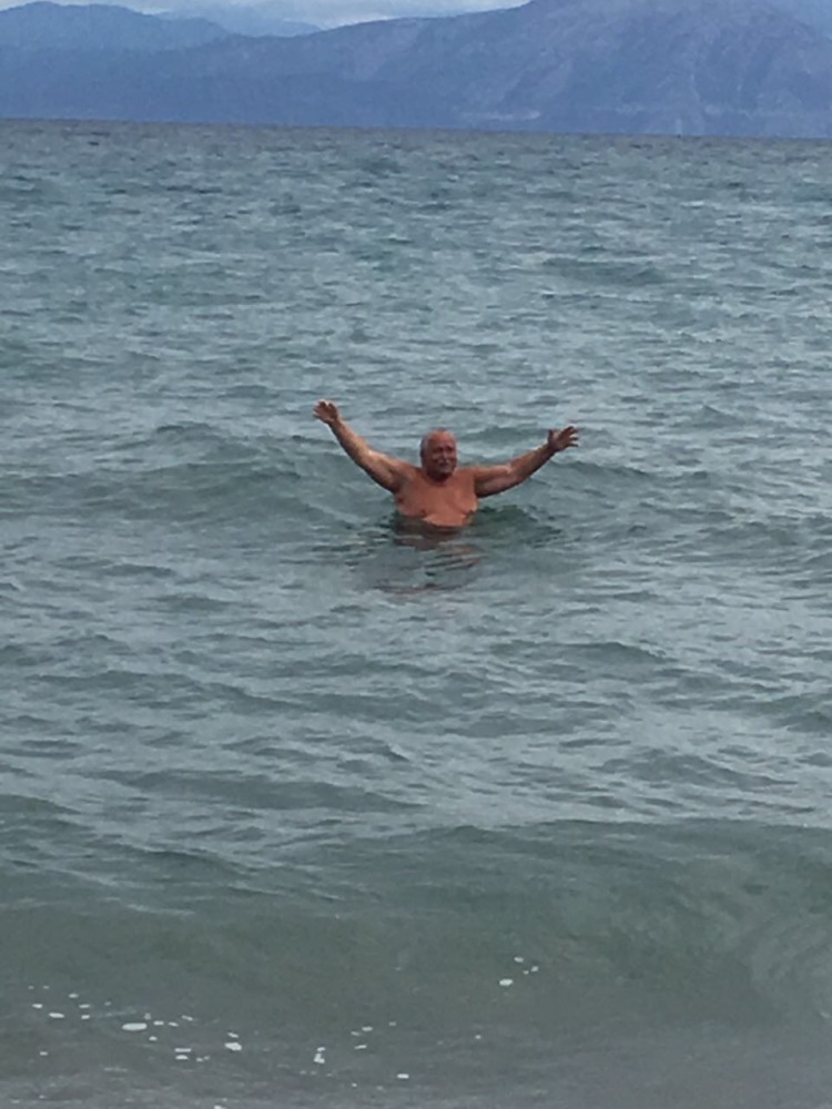 Дело происходило в Греции, на берегу Ионического моря в местечке Kato Achaia. Нежная прозрачная вода морского залива, ничуть не нарушенная даже мелкой рябью, а не то чтобы крупными волнами, так и притягивала прямо с утра, так и манила.