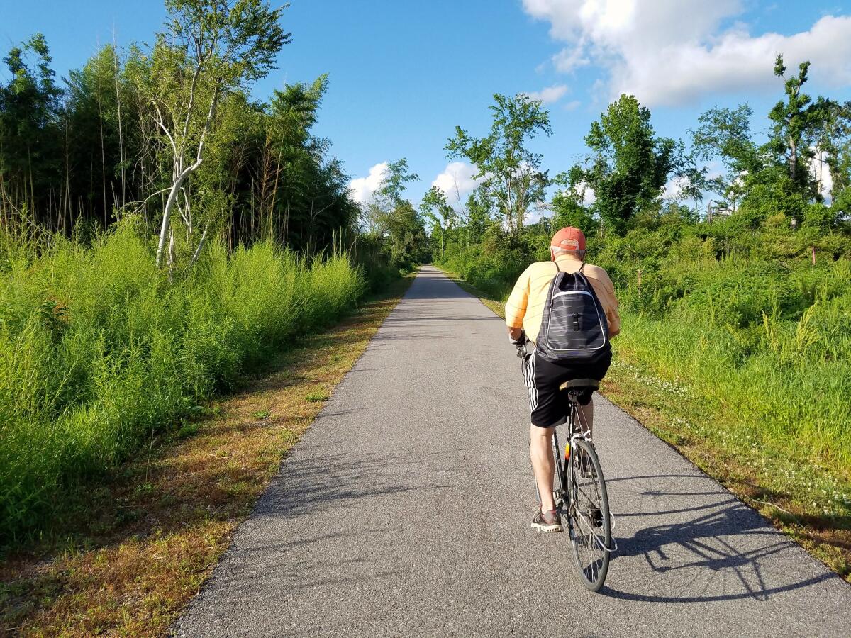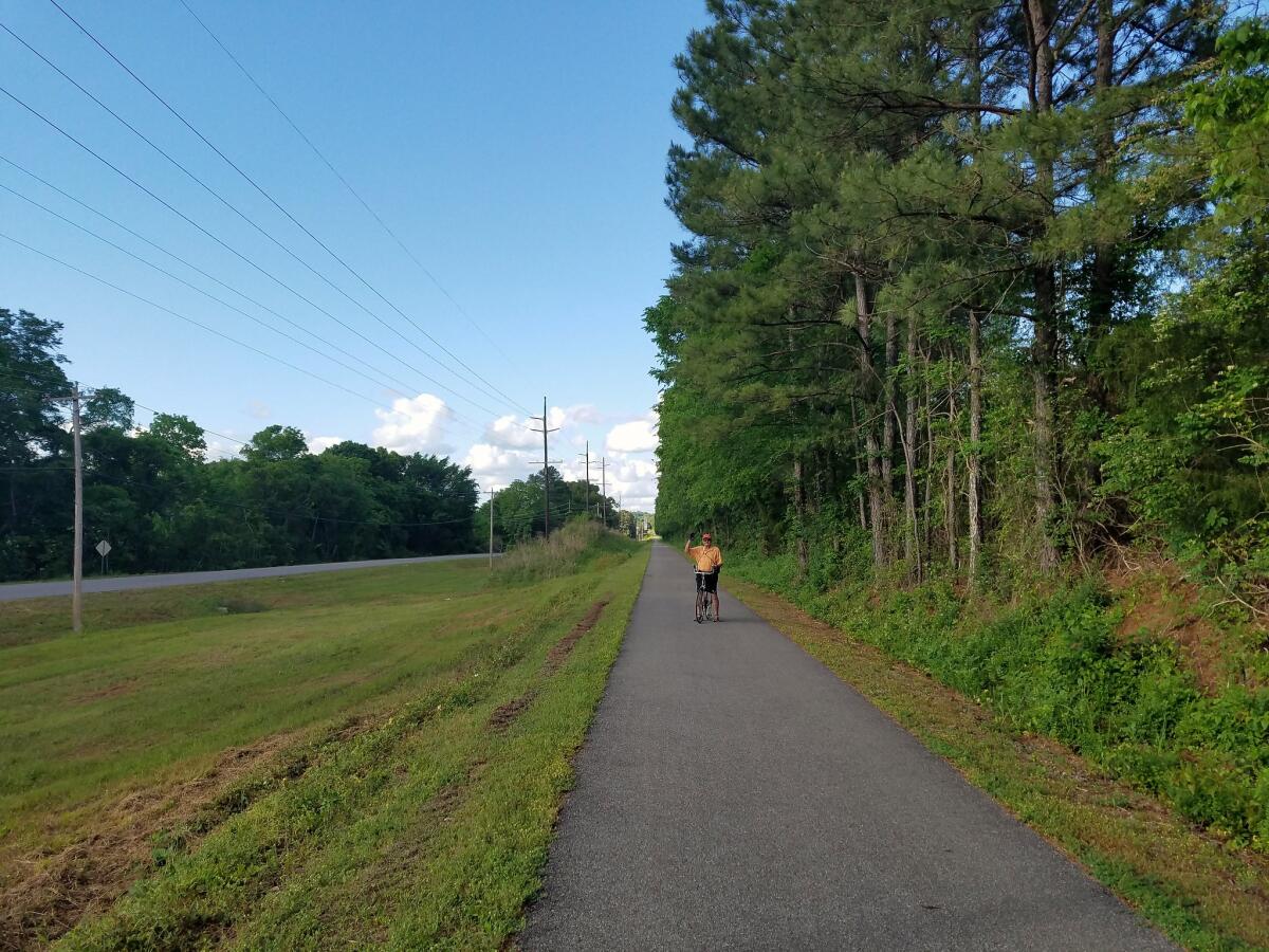 Удивила главная фишка велоцентра — это велодорожка, проложенная по б/у железнодорожного пути по невысокой насыпи, примерно на ширину шпал. Нет никаких тебе крутых поворотов и подъёмов, организатор поездки сказал, что по этой велодорожке можно доехать до Атланты.