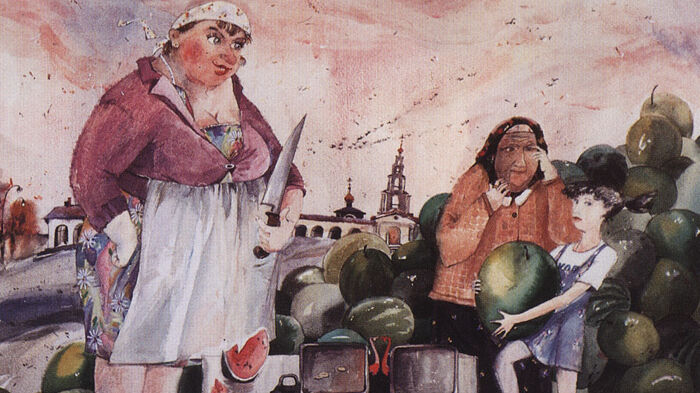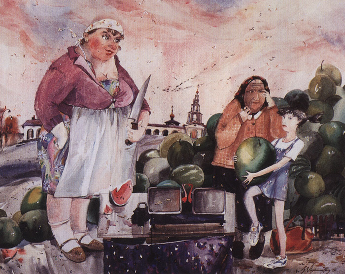 Отец взвешивает арбузы, говорит покупателю, сколько тот должен заплатить. Берёт деньги, кладёт их в мешок и говорит сыну, сколько надо дать сдачи, если требуется. Сын берёт из этого же мешка деньги на сдачу и расплачивается с покупателем, а отец в это время уже занимается следующим.