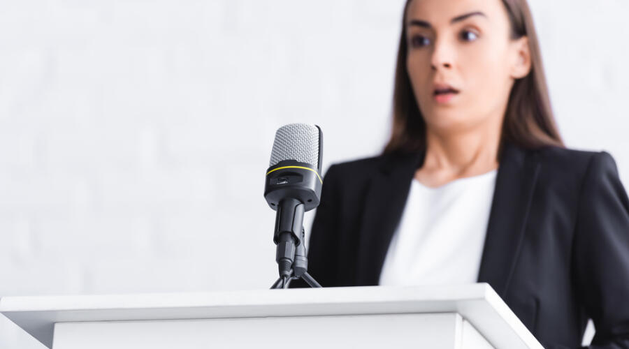 Если вы чувствуете, что страх сковывает, начинайте говорить свою речь утрированно громко и чётко, концентрируйтесь на чёткости и отточенности звуков. Это психологический приём. Чёткость и громкость свидетельствует о вашей уверенности в себе. Соответственно, работает и обратная связь: ваша громкость и чёткость вызывает в вас уверенность в себе.
