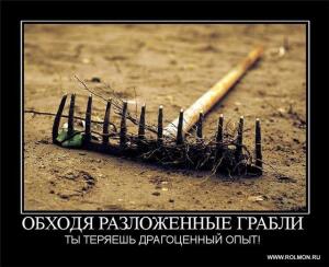 Олег Силантьев, "+" опыт надо вознести на пьедестал, вы верно говорите. А вот "-" закидывать в чулан нельзя, абы не протух, лучше вернуть эту "какашку" тем, кто вам ее подкинул. Должно же быть стремление надавать по соплям нехорошим людям