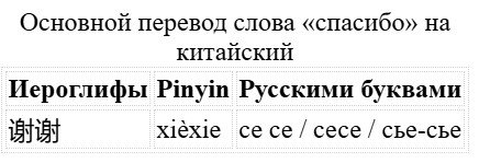 Основной и самый распространённый перевод слова «спасибо» на китайском — 谢谢. В стандартном китайском языке, то есть в путунхуа (мандарине), это читается как xièxie.