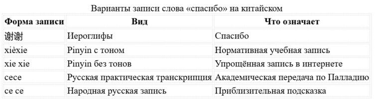 Здесь важна одна техническая деталь. xie и xiè — не разные слова, а разные способы записи одного и того же слога. Форма xie — упрощённая запись без тонов. Форма xiè — запись с тоновым знаком. Когда пользователь ищет xie спасибо, он обычно хочет понять именно это соответствие: 谢谢 = xièxie = xie xie = спасибо.