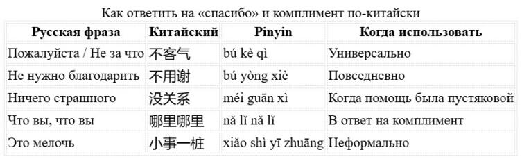Знать, как сказать «спасибо», — это половина дела. Не менее важно понимать, как на него ответить. В китайской культуре ответы на благодарность отражают скромность и часто указывают на то, что оказанная услуга не стоила особой благодарности. Это, кстати, заметно отличается от, скажем, итальянского, немецкого или французского подхода, где ответ на благодарность обычно более прямолинеен.
