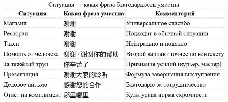 Говорить 谢谢 уместно почти в любых базовых бытовых ситуациях: в магазине, такси, ресторане, при получении помощи и в обычном разговоре. Это безопасный универсальный вариант для иностранца — довольно простые слова, которые работают практически везде.