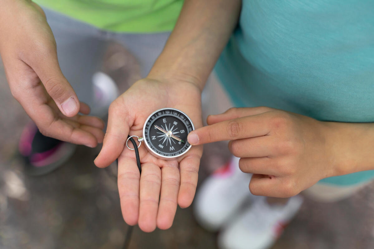 Знакомим с компасом. Во время прогулки играем в игру «запомни обратный путь». Путешествуя с малышом по открытой местности, стараемся выделить ориентиры для определения обратного пути. Теперь ставим ту же задачу в лесу. Ребенок должен сам убедиться, что сделать это очень сложно.