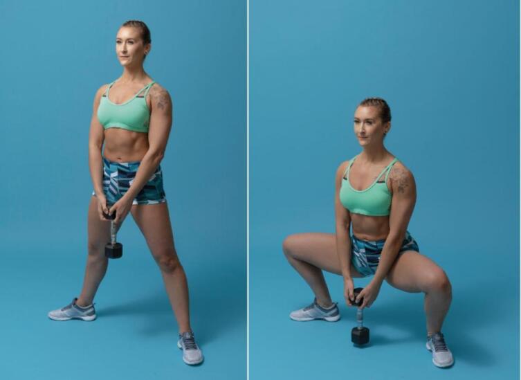 Хорошо проработать мышцы ног поможет плие с гантелью. Ноги ставятся широко, а снаряд берется в обе руки между ног. Выполняется глубокий присед. Колени при этом должны оставаться на уровне плеч.