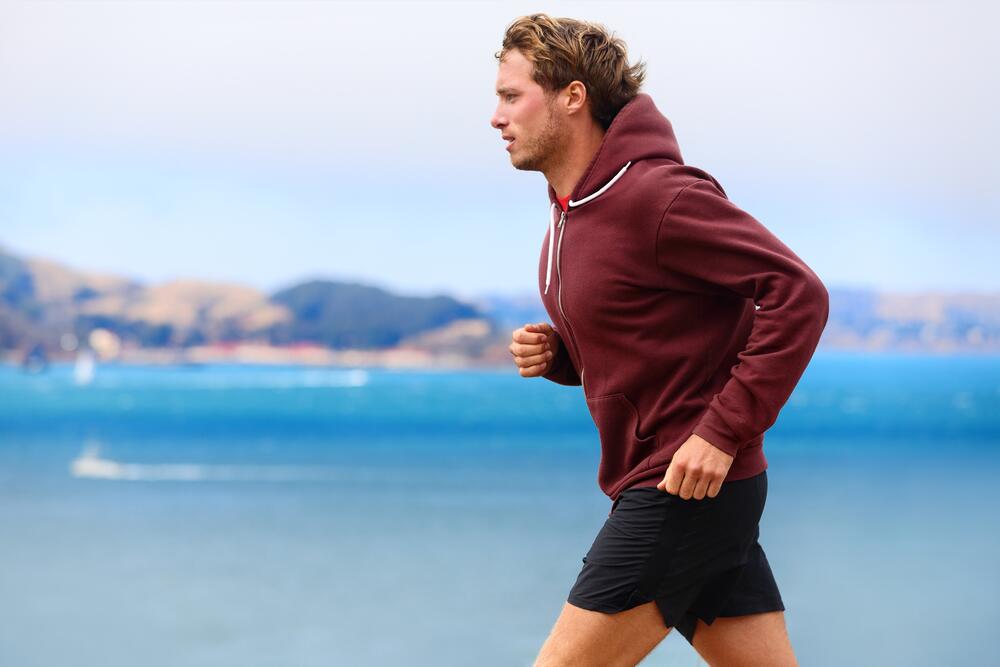 Если тепло и светит солнце, температура от 17 до 30 градусов: то одеваться стоит как можно легче — спортивные шорты и, для девушек, топик или купальник. Парни вообще могут идти с голым торсом. При температуре выше 30 градусов надо вести себя осторожно, чтобы не получить тепловой удар или перегрев организма, можно сократить время пробежки, желательно, чтобы рядом было, где найти воду. При палящем солнце обязательно надевайте головной убор — лучше всего бандану. Лёгкие удобные кроссовки, а носки можно не надевать. Если вы уверены, что не повредите ноги — то крайне полезно бегать босиком.