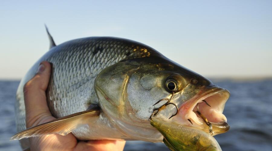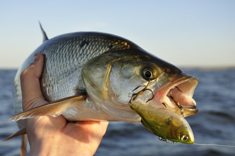 Обычный его прием: жерех на большой скорости врезается в косяк мелочи, оглушает ее ударом мощного хвоста, выпрыгивает свечой над поверхностью воды и падает обратно с шумом и брызгами, повторяя этот маневр несколько раз. Испуганная мелочь то там, то здесь выскакивает из воды, а он, развернувшись вниз по течению, подхватывает оглушенных мальков.