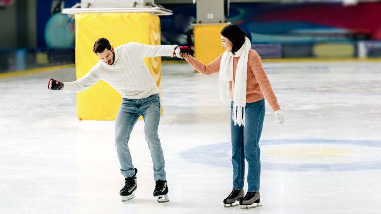 Повторим главные принципы катания на коньках: не толкаться зубцами — согнуть колени — развернуть носки — переносить вес с ноги на ногу.
