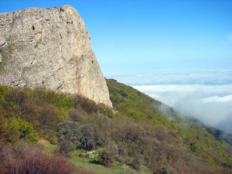 Интересно будет подняться на вершину скалы. Для этого нужно пройти через лес к её северной стороне. Здесь можно залезть наверх, в чём поможет привязанная кем-то верёвка. С вершины открываются виды на побережье, озёра внизу и яйлу, откуда мы пришли. После спуска полезно прогуляться к западной части скалы, где находится небольшая пещерка.