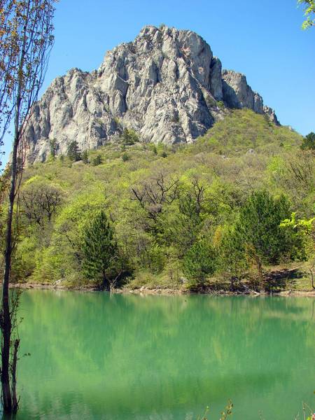 Пройдём от перевала полкилометра на запад и начнём спускаться по тропе в юго-западном направлении. Примерно через час мы окажемся возле крупной скалы Биюк-Исар (773 м) и двух озёр у её подножия. В озёра впадает горная речка, в которой можно брать воду для питья. Здесь можно разбить лагерь и остаток дня посвятить отдыху в этом прекрасном месте.