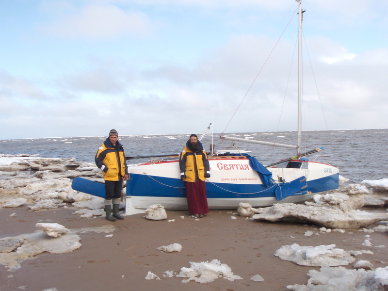 Подробности похода в дневниках Георгия столь объемны, детальны и эмоциональны, что мне приходится просто кратко их изложить. Каково это, грести в шторм! Парус при встречном ветре ставить приходится нечасто. Вот застряли во льдах, сели на отмель, и в отлив 6 часов можно отдыхать. Уставший от морской болезни Дмитрий заметно оживляется, увлеченно фотографирует неведомые ему доселе пейзажи. В походе он главный фотограф и оператор видеосъемок. Зато Георгий и Андрей помогают Дмитрию в переноске икон, облачения и всего нужного при проведении крещения, божественных литургий и т. п. Да и в ежедневных молитвах капитан и матрос — верные послушники.
