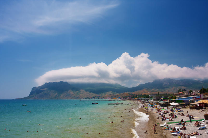 В отличие от морской воды в самой Феодосии, в Коктебеле море более чистое и водорослей почти нет. Галька белесая. В сезон, то есть с 15 июля и позже, если придти уже после 9 утра с пляжным ковриком и зонтиком, реально только найти место, куда воткнуть зонтик. А вот побольше места — для того чтобы коврик расстелить — здесь найти уже намного сложнее. Всюду люди!