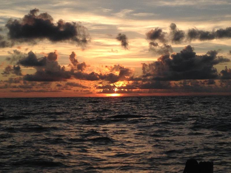 Любуюсь гладким океаном, красивыми закатами и облаками. Медитирую. Слушаю красивую музыку и аудиокниги. Пожалел, что не взял фильмы — на Ipad закачать их бесплатно не получилось, а ноутбук не отдала дочь. Лучше бы все же взял. Общаюсь с семьей с помощью спутникового телефона Iridium.