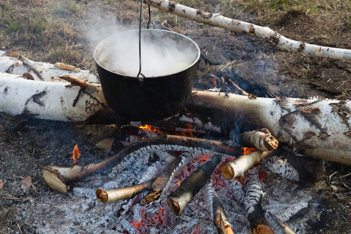 Никаких изысков! Ставим котелок на огонь и засыпаем в него измельченные морковь, лук, картофель. Добавляем немного лаврового листа, укропа и солим по вкусу. Ждем, пока закипит.