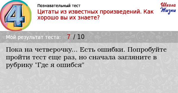 Литературный тест на эрудицию. Как часто мы пользуемся цитатами из известных произведений, народной лирики, фильмов в повседневной жизни, а помним ли первоисточник? Цитата — дословная выдержка из какого-то произведения. Она может быть афоризмом, крылатым выражением, эпиграфом. Проверьте свою память.