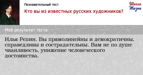Развлекательный тест. Каждый из нас, наверное, в душе художник. И тут совсем неважно умение писать картины: во-первых, этому можно научиться, а, во-вторых, передавать внутренние ощущения доступно посредством чего угодно, даже рисуя лишь мысленно. Предлагаем узнать с помощью теста, с каким русским художником у вас есть нечто общее.