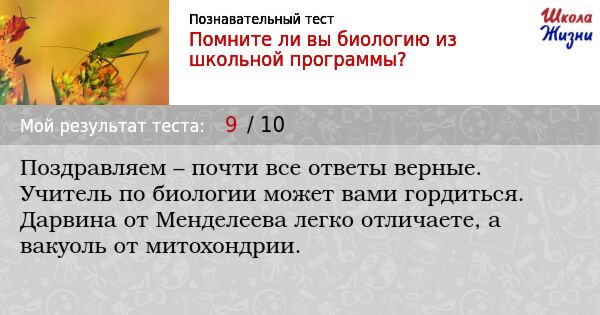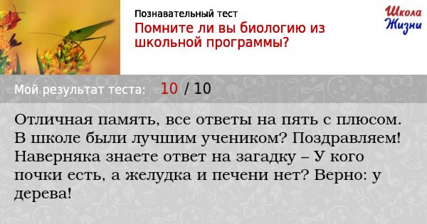 Уроки биологии… Самые любимые, они о живом мире вокруг нас. Био — это жизнь. Биология — наука о живом и постоянно воспроизводимом, о взаимодействии всего на планете. От бактерий и растений до животных и человека. Что помните вы из школьного курса биологии? Проверьте свои знания, поделитесь результатами с друзьями.