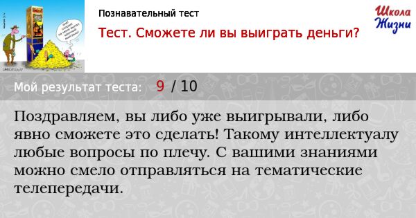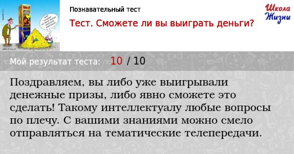 Существует множество телевизионных игр, где по правилам необходимо ответить на вопросы, порой довольно каверзные, для выигрыша определенной суммы денег. Попробуйте представить себя участником подобной телевикторины, попытавшись правильно ответить на вопросы нашего теста.