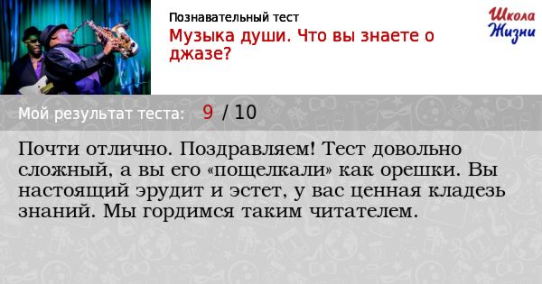 Тест на музыкальную эрудицию. Джаз – синтез разных музыкальных направлений, культур и традиций. Африканский регтайм + южно-американский блюз = джаз. Молодое музыкальное направление, зародившееся в США в конце 19 – начале 20 века, стало популярным и любимым во всем мире.