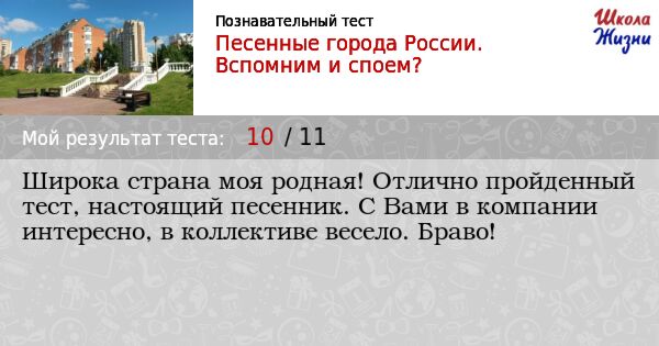 В этом тесте собраны вопросы о самых знаменитых песенных городах России. Вспомните, спойте.